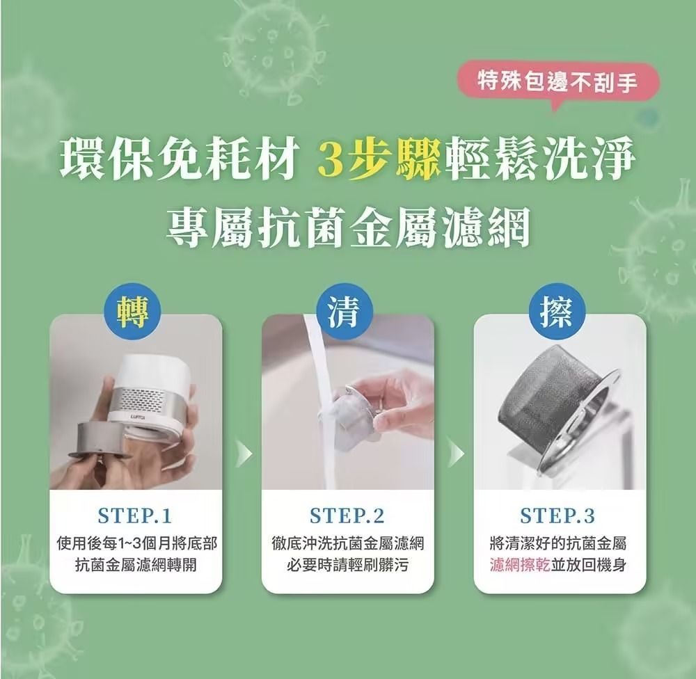 ●抗菌金屬濾網,清水洗淨重複使用