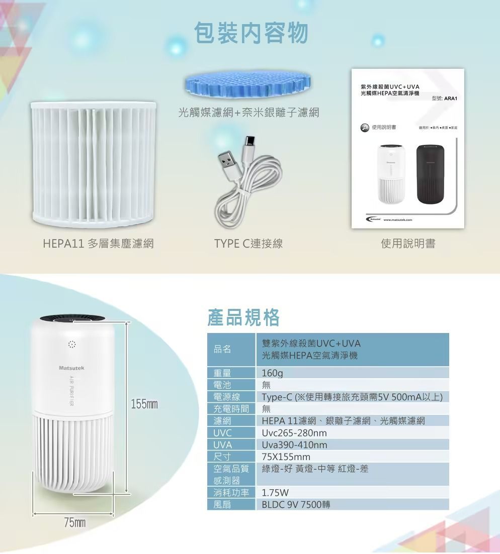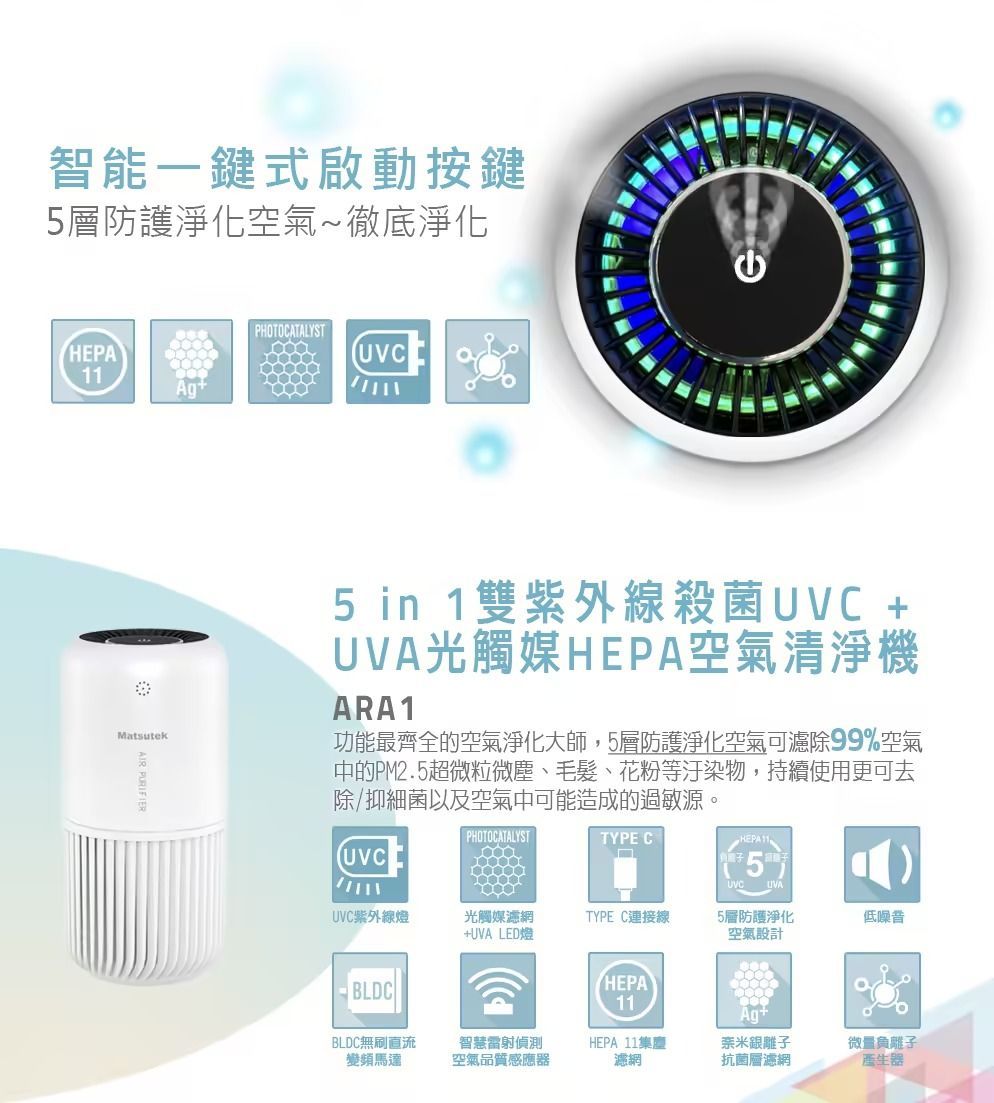 品名:Matsutek ∣ 雙紫外線殺菌空氣清淨機